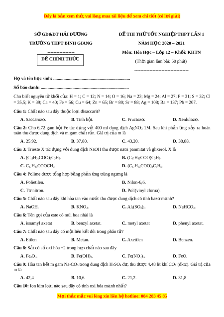 Đây là bản xem th , vu ử i lòng mua tài li u ệ đ xe ể m chi ti t ế (có l i ờ gi i ả ) SỞ GD&ĐT H I Ả DƯƠNG Đ Ề THI TH Ử T T Ố NGHI P Ệ THPT L N Ầ 1 TRƯ N Ờ G THPT BÌNH GIANG