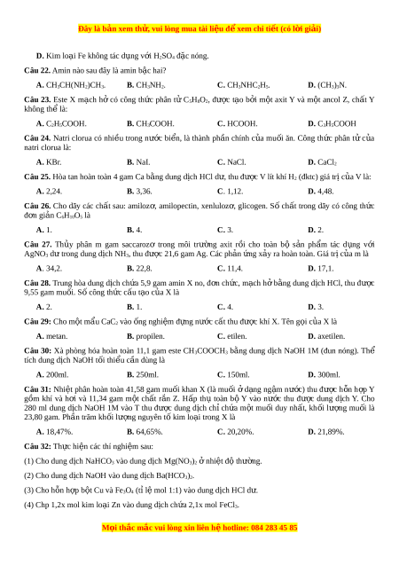 Câu 28. Trung hòa dung d c ị h ch a ứ 5,9 gam amin X no, đ n ơ ch c ứ , m c ạ h h ở b ng ằ dung d c ị h HCl, thu đư c ợ 9,55 gam mu i ố . S c ố ông th c ứ cấu t o c ạ a ủ X là A. 2. B. 1. C. 4. D. 3. Câu 29: Cho m t ộ mẩu CaC2 vào ng nghi ố ệm đ ng n ự ư c ớ cất thu đư c ợ khí X. Tên g i ọ c a ủ X là A. metan. B. propilen. C. etilen. D. axetilen.