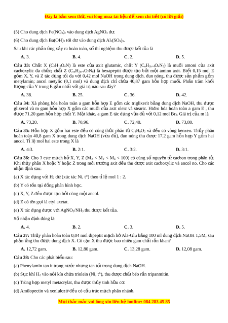 ị h NaOH 1M (đun nóng). Thể tích dung d c ị h NaOH t i ố thi u ể c n dùng l ầ à A. 200ml. B. 250ml. C. 150ml. D. 300ml. Câu 31: Nhi t