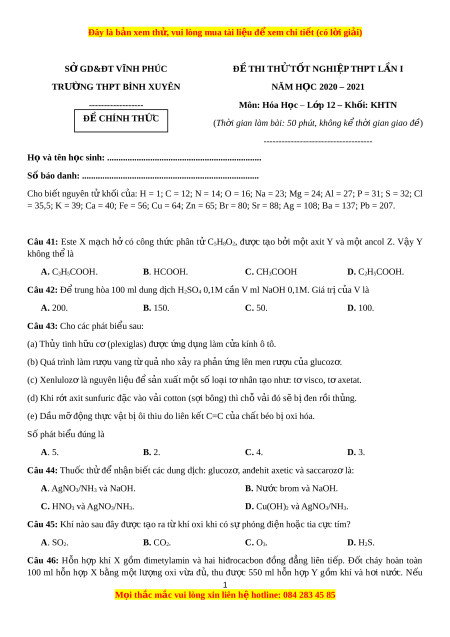 NĂM HỌC 2020 – 2021 ------------------ Môn: Hóa H c ọ – L p ớ 12 – Kh i ố : KHTN Đ C Ề HÍNH TH C Ứ (Th i