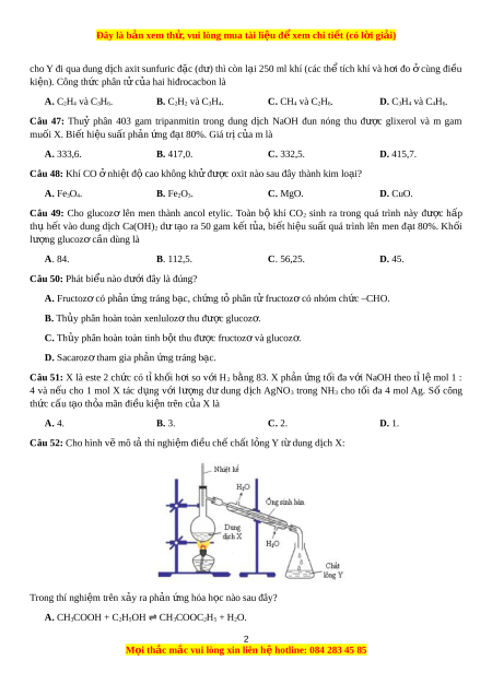 Câu 51: X là este 2 ch c ứ có t ỉkh i ố h i ơ so v i ớ H2 bằng 83. X ph n ả ng ứ t i ố đa v i ớ NaOH theo t ỉl ệ mol 1 : 4 và n u ế cho 1 mol X tác d ng ụ v i ớ lư ng ợ d ư dung d c ị h AgNO3 trong NH3 cho t i ố đa 4 mol Ag. Số công th c ứ cấu tạo th a ỏ mãn đi u ki ề n ệ trên c a ủ X là A. 4. B. 3. C. 2. D. 1. Câu 52: Cho hình v m ẽ ô tả thí nghi m ệ đi u c ề h c ế hất l ng ỏ Y từ dung d c ị h X: Trong thí nghi m