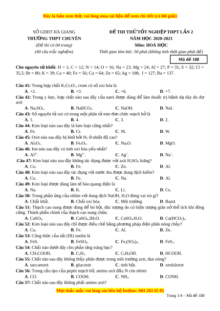 Đây là bản xem th , vu ử i lòng mua tài li u ệ đ xe ể m chi ti t ế (có l i ờ gi i ả ) S G Ở DĐT HÀ GIANG Đ Ề THI TH Ử TỐT NGHI P Ệ THPT L N Ầ 2 TRƯ N Ờ G THPT CHUYÊN NĂM H C Ọ 2020-2021