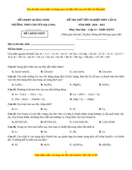 TRƯỜNG THPT CHUYÊN H LO Ạ NG NĂM H C Ọ 2020 – 2021 ------------------ Môn: Hóa H c ọ – L p ớ 12 – Kh i ố : KHTN Đ C Ề HÍNH TH C Ứ (Th i