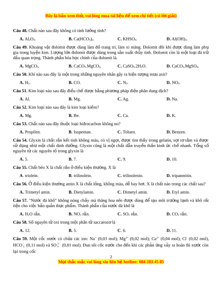 Câu 48. Chất nào sau đây không có tính lư ng ỡ tính? A. Al2O3. B. Ca(HCO3)2. C. KHSO4. D. Al(OH)3.