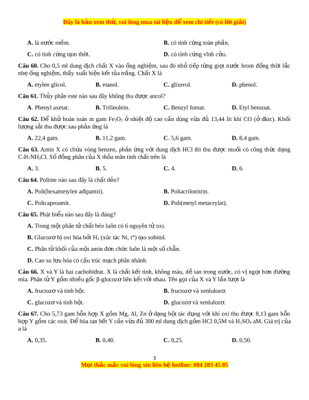 Câu 63. Amin X có ch a ứ vòng benzen, ph n ả ng ứ v i ớ dung d c ị h HCl thì thu đư c ợ mu i ố có công th c ứ d ng ạ C7H7NH3Cl. S đ ố ng phâ ồ n c a ủ X th a ỏ mãn tính ch t ấ trên là A. 3. B. 5. C. 4. D. 6.