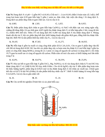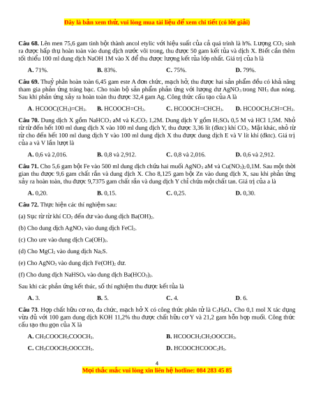 xảy ra hoàn toàn, thu đư c ợ 9,7375 gam chất r n và ắ dung d c ị h Y chỉ ch a ứ m t ộ chất tan. Giá tr c ị a ủ a là A. 0,20. B. 0,15. C. 0,25. D. 0,30. Câu 72. Th c ự hiện các thí nghi m ệ sau: (a) S c ụ t t ừ ừ khí CO2 đến d và ư o dung d c ị h Ba(OH)2. (b) Cho dung d c ị h AgNO3 vào dung d c ị h FeCl2. (c) Cho ure vào dung d c ị h Ca(OH)2. (d) Cho MgCl2 vào dung d c ị h Na2S. (e) Cho AgNO3 vào dung d c ị h Fe(OH)2 d . ư (f) Cho dung d c ị h NaHSO4 vào dung d c ị h Ba(HCO3)2. Sau khi các phản ng k ứ t ế thúc, s t ố hí nghi m ệ thu đư c ợ k t ế t a ủ là A. 3. B. 5. C. 4. D. 6. Câu 73. H p ợ chất h u ữ cơ no, đa ch c ứ , m c ạ h hở X có công th c