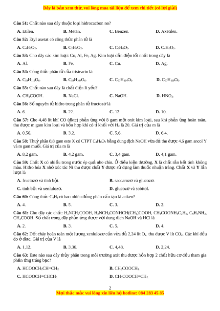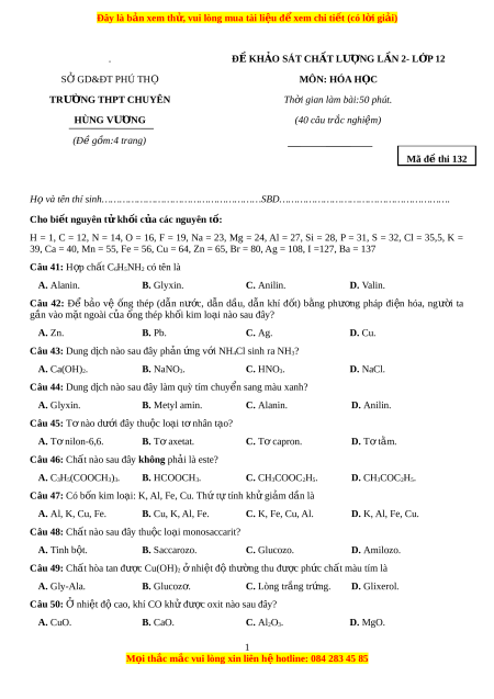 Câu 49: Chất hòa tan đư c ợ Cu(OH)2 nhi ở ệt đ t ộ hư ng ờ thu đư c ợ ph c ứ chất màu tím là A. Gly-Ala. B. Glucoz . ơ C. Lòng trắng tr ng. ứ D. Glixerol. Câu 50: nhi Ở ệt đ c ộ ao, khí CO khử đư c ợ oxit nào sau đây? A. CuO. B. CaO. C. Al2O3. D. MgO. 1 M i ọ thắc m c
