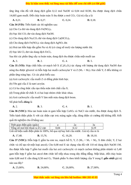Câu 34 (VD): Tiến hành các thí nghi m ệ sau: (a) Cho Cu d và ư o dung d c ị h Fe(NO3)3. (b) S c ụ khí CO2 d và ư o dung d c ị h NaOH. (c) Cho dung d c ị h Na2CO3 d và ư o dung d c ị h Ca(HCO3)2. (d) Cho dung d c ị h Fe(NO3)2 vào dung d c ị h AgNO3 d . ư (e) Hoà tan h n h ỗ p ợ rắn g m ồ Na và Al (có cùng s m ố ol) vào lư ng ợ nư c ớ d . ư (f) S c ụ khí Cl2 dư vào dung d c ị h FeCl2. Sau khi các phản ng x ứ ảy ra hoàn toàn, dung d c ị h thu đư c ợ ch a ứ m t ộ mu i ố tan A. 3. B. 2. C. 4. D. 5. Câu 35 (VD): H p ợ chất h u ữ cơ m c