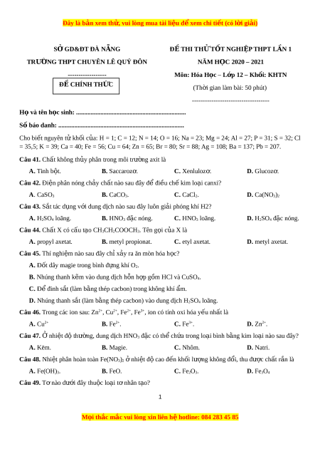 Đề thi thử Hóa Học trường Chuyên lê Quý Đôn năm 2021