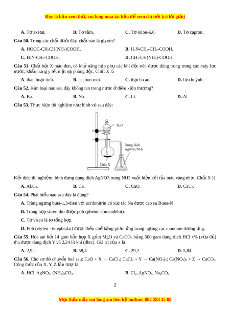 Câu 52. Kim loại nào sau đây không tan trong nư c ớ ở đi u ki ề n t ệ hư ng? ờ A. Ba. B. Na. C. Li. D. Al Câu 53. Th c ự hiện thí nghi m ệ nh hì ư nh v s ẽ au đây: Kết thúc thí nghi m ệ , bình đ ng ự dung d c ị h AgNO3 trong NH3 xu t ấ hi n ệ k t ế t a ủ màu vàng nh t ạ . Ch t ấ X là A. Al4C3. B. Ca. C. CaO. D. CaC2. Câu 54. Phát bi u nà ể o sau đây là đúng? A. Trùng ng ng but ư a-1,3-đien v i