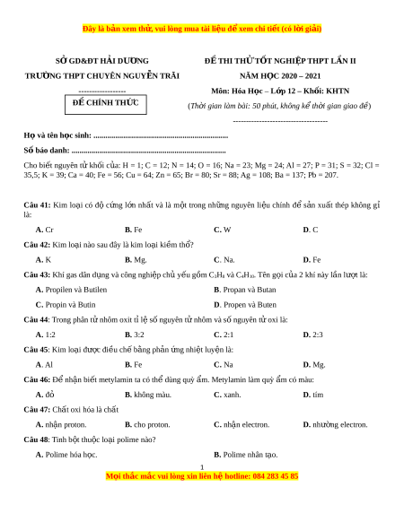 Đề thi thử Hóa Học trường Chuyên Nguyễn Trãi lần 2 năm 2021