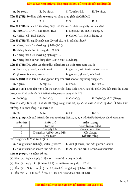 Đây là bản xem th , vu ử i lòng mua tài li u ệ đ xe ể m chi ti t ế (có l i ờ gi i ả ) A. T a ơ xetat. B. Tơ nitron. C. T ni ơ lon-6,6. D. T vi ơ sco. Câu 23 (TH): S đ ố ng ồ phân este ng v ứ i ớ công th c ứ phân t C ử 3H6O2 là A. 4. B. 2. C. 3. D. 5.