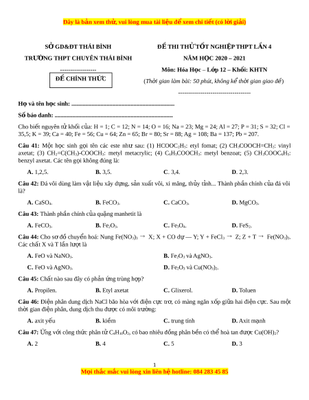 Ờ G THPT CHUYÊN THÁI BÌNH NĂM H C Ọ 2020 – 2021 ------------------ Môn: Hóa H c ọ – L p ớ 12 – Kh i ố : KHTN Đ C Ề HÍNH TH C Ứ (Th i