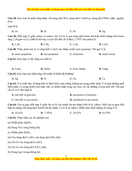 Đây là bản xem th , vu ử i lòng mua tài li u ệ đ xe ể m chi ti t ế (có l i ờ gi i ả ) Câu 58: Kim lo i ạ M ph n ả ng ứ đư c ợ v i ớ dung d c ị h HCI, dung d c ị h Cu(NO3)2, dung d c ị h HNO3 (đặc, ngu i ộ ). Kim loại M là A. Zn. B. Al C. Fe. D. Ag. Câu 59: H n ỗ h p ợ X g m