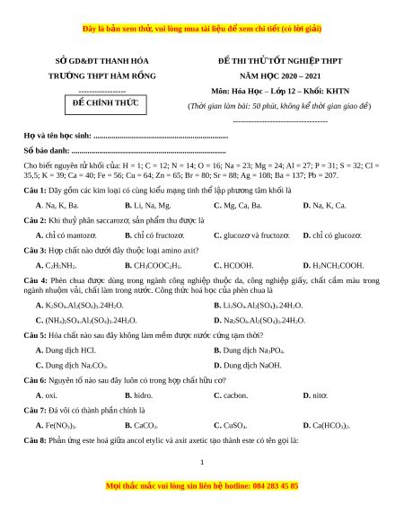 SỞ GD&ĐT THANH HÓA Đ Ề THI TH Ử TỐT NGHI P Ệ THPT TRƯỜNG THPT HÀM R N Ồ G NĂM H C Ọ 2020 – 2021 ------------------ Môn: Hóa H c ọ – L p ớ 12 – Kh i ố : KHTN Đ C Ề HÍNH TH C Ứ (Th i