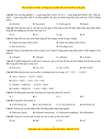 ị h CuSO4 2% và 2 – 3 gi t ọ dung d c ị h NaOH 10%. Ti p ế t c ụ nhỏ 2 – 3 gi t ọ dung d c ị h ch t ấ X vào ng ố nghi m ệ , l c ắ nh , ẹ thu đư c ợ dung d c ị h màu xanh lam. Ch t ấ X không thể là A. Glyxerol. B. Saccaroz . ơ C. Etylen glycol. D. Etanol. Câu 50: Tr n ộ b t ộ kim lo i ạ X v i ớ b t ộ oxit s t ắ (g i ọ là h n ỗ h p ợ tecmit) để th c ự hi n ệ ph n ả ng ứ nhi t ệ nhôm dùng để hàn đư ng ờ ray tàu h a ỏ . Kim loại X là A. Fe B. Cu C. Ag D. Al Câu 51: H p c ợ hất nào c a ủ canxi đư c ợ dùng đ đúc ể tư ng, ợ bó b t ộ khi gãy xư ng? ơ