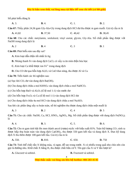 Câu 68: Cho các ch t: metylamin, xenluloz , vinyl axetat, glyxin, Gly-Ala. S ch t ph n ng đ c v iấ ơ ố ấ ả ứ ượ ớ