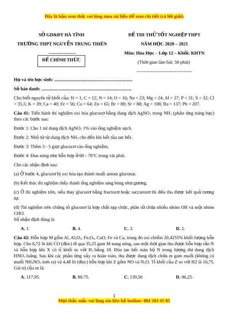 - Tailieugiaovien.com.vn giới thiệu Đề thi thử Hóa Học trường Nguyễn Trung thiên năm 2021 bản word có lời giải chi tiết.
