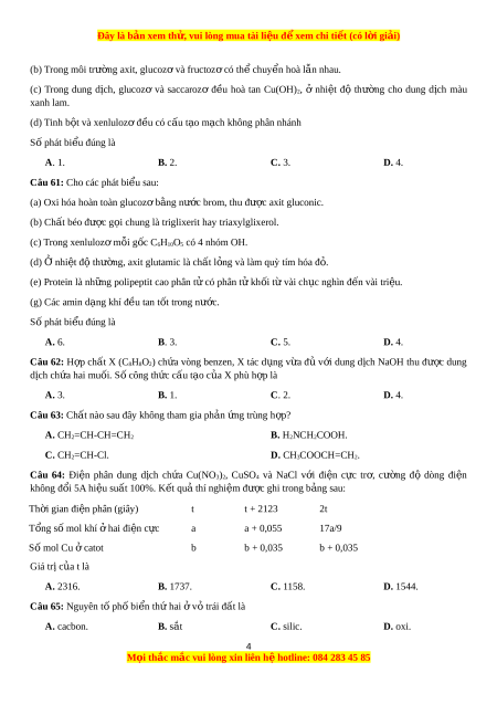 ứ Cu(NO3)2, CuSO4 và NaCl v i ớ đi n ệ c c ự tr , ơ cư ng ờ độ dòng đi n ệ không đ i ổ 5A hi u s ệ uất 100%. K t ế quả thí nghi m ệ đư c ợ ghi trong b ng s ả au: Th i ờ gian đi n phâ ệ n (giây) t t + 2123 2t T ng ổ s m ố ol khí ha ở i đi n c ệ c ự a a + 0,055 17a/9 S m ố ol Cu c ở atot b b + 0,035 b + 0,035 Giá tr c ị a ủ t là A. 2316. B. 1737. C. 1158. D. 1544. Câu 65: Nguyên t ph ố ố biển thứ hai v ở ỏ trái đất là A. cacbon. B. sắt C. silic. D. oxi. 4 M i ọ thắc m c