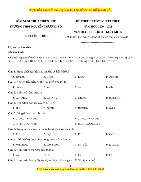 Đây là bản xem th , vu ử i lòng mua tài li u ệ đ xe ể m chi ti t ế (có l i ờ gi i ả ) SỞ GD&ĐT TH A Ừ THIÊN HUẾ Đ Ề THI TH Ử TỐT NGHI P Ệ THPT TRƯ N Ờ G THPT NGUY N Ễ TRƯ N Ờ G TỘ NĂM H C Ọ 2020 – 2021 ------------------ Môn: Hóa H c ọ – L p ớ 12 – Kh i ố : KHTN Đ C Ề HÍNH TH C Ứ (Th i
