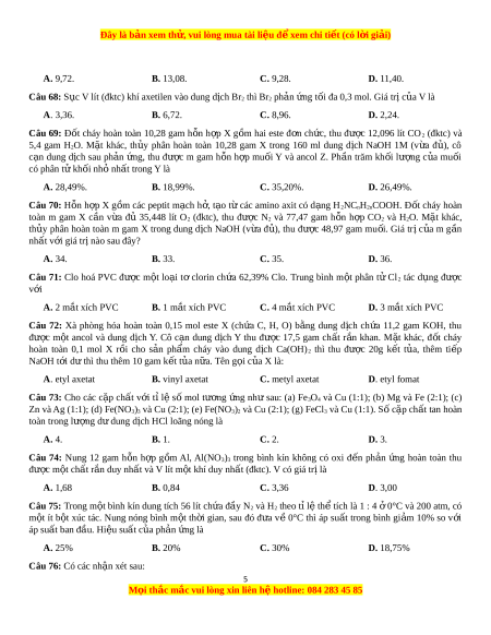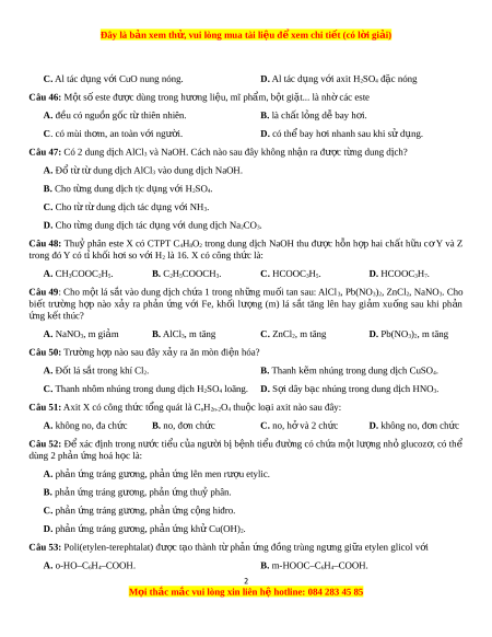 Đây là bản xem th , vu ử i lòng mua tài li u ệ đ xe ể m chi ti t ế (có l i ờ gi i ả ) C. Al tác d ng v ụ i ớ CuO nung nóng. D. Al tác d ng v ụ i ớ axit H2SO4 đặc nóng Câu 46: M t ộ s e ố ste đư c ợ dùng trong hư ng l ơ i u, ệ mĩ ph m ẩ , b t ộ gi t ặ ... là nh c ờ ác este A. đều có ngu n g ồ c ố từ thiên nhiên. B. là chất l ng ỏ d ba ễ y h i ơ . C. có mùi th m ơ , an toàn v i ớ ngư i ờ . D. có thể bay h i ơ nhanh sau khi s d ử ng. ụ Câu 47: Có 2 dung d c