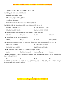 C. CH3COONa và C2H5OH. D. HCOONa và C2H5OH. Câu 59: Trong dung d c ị h, H2N–CH2–COOH t n ồ t i ạ ch y ủ u ế d ở ng ạ A. anion B. phân t t ử rung hoà C. ion lư ng ỡ c c ự D. cation Câu 60: ng Ứ v i