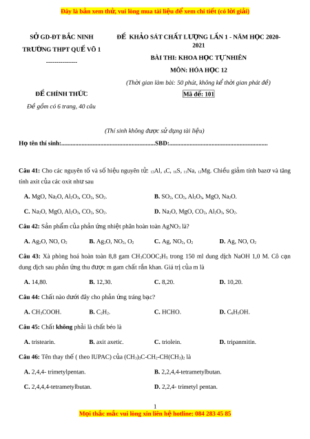 Ợ G LẦN 1 - NĂM H C Ọ 2020- 2021 TRƯ N Ờ G THPT QU Ế VÕ 1 BÀI THI: KHOA H C Ọ T N Ự HIÊN --------------- MÔN: HÓA HỌC 12 (Th i
