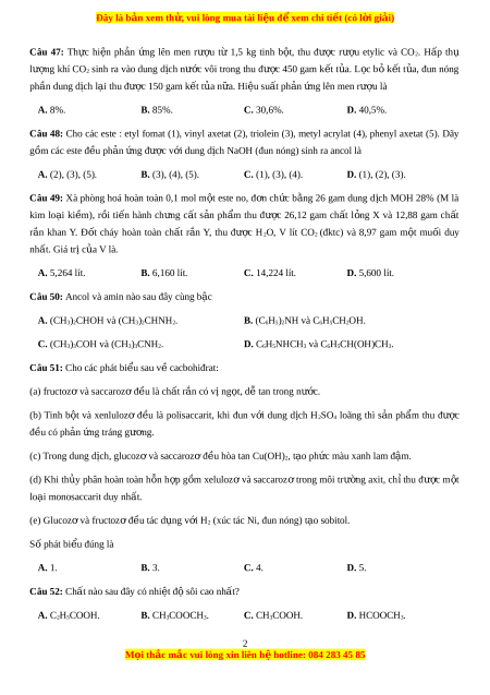 Đây là bản xem th , vu ử i lòng mua tài li u ệ đ xe ể m chi ti t ế (có l i ờ gi i ả ) Câu 47: Th c ự hi n ệ ph n ả ng ứ lên men rư u ợ từ 1,5 kg tinh b t ộ , thu đư c ợ rư u