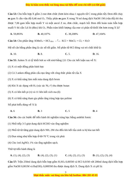 Đây là bản xem th , vu ử i lòng mua tài li u ệ đ xe ể m chi ti t ế (có l i ờ gi i ả ) Câu 53: Cho h n h ỗ p X ợ g m ồ 2 este đ n ơ ch c ứ (h n ơ kém nhau 1 nguyên t C t ử rong phân t ). Đ ử em đ t ố cháy m gam X c n ầ v a ừ đ 0,46 ủ mol O2. Th y