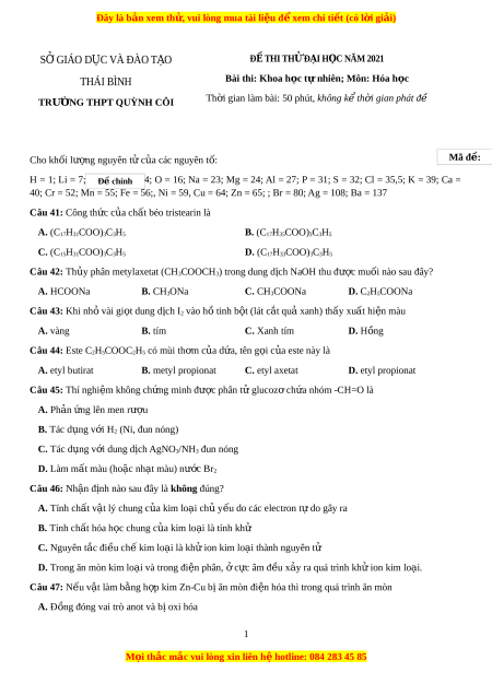 Đây là bản xem th , vu ử i lòng mua tài li u ệ đ xe ể m chi ti t ế (có l i ờ gi i ả ) S Ở GIÁO D C Ụ VÀ ĐÀO T O Ạ Đ Ề THI TH Ử Đ I Ạ H C Ọ NĂM 2021 THÁI BÌNH Bài thi: Khoa h c ọ t n