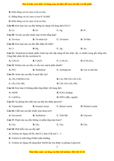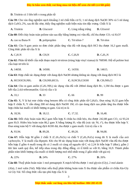 Câu 57: Peptit nào sau đây không có phản ng m ứ àu biure? A. Gly4 B. Gly5 C. Gly2 D. Gly3 Câu 58: Phát bi u nà ể o sau đây sai? A. Triolein tác d ng v ụ i ớ Br2 d / ư CCl4 theo t l ỉ ệ mol 1 : 3