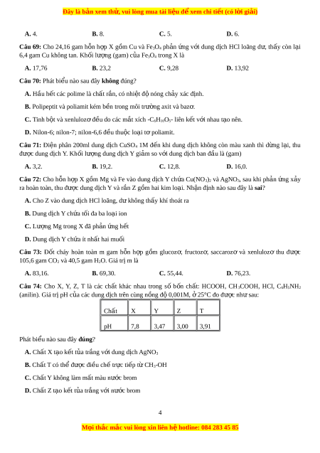 Câu 74: Cho X, Y, Z, T là các ch t ấ khác nhau trong số b n ố ch t