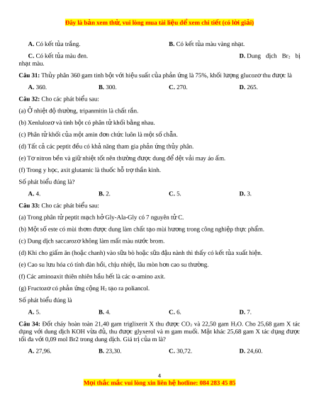 Đây là bản xem th , vu ử i lòng mua tài li u ệ đ xe ể m chi ti t ế (có l i ờ gi i ả ) A. Có kết t a ủ trắng. B. Có kết t a ủ màu vàng nhạt. C. Có kết t a ủ màu đen. D. Dung d c ị h Br2 bị nhạt màu. Câu 31: Th y phâ ủ n 360 gam tinh b t ộ v i ớ hi u s ệ u t ấ c a ủ ph n ả ng l ứ à 75%, kh i ố lư ng gl ợ ucozơ thu đư c ợ là A. 360. B. 300. C. 270. D. 265.