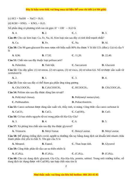 ơ Gly-Gly, Ala-Ala-Ala, protein, sobitol. Trong môi trư ng ờ ki m ề , số dung d c ị h tác d ng đ ụ ư c ợ v i ớ Cu(OH)2 tạo h p c ợ hất màu tím là 2 M i ọ thắc m c