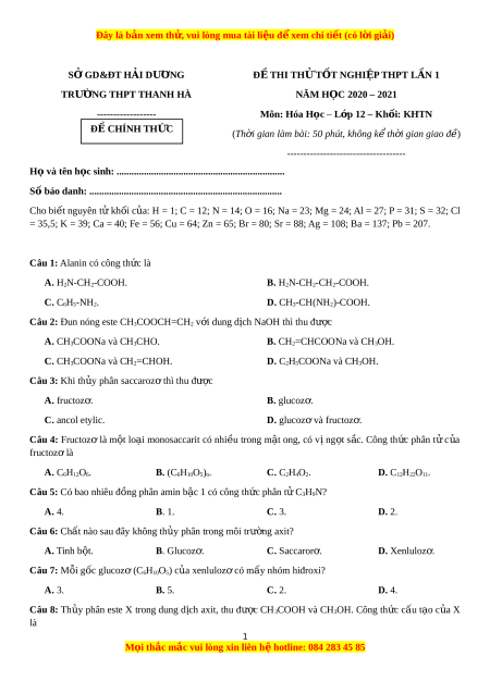 Đây là bản xem th , vu ử i lòng mua tài li u ệ đ xe ể m chi ti t ế (có l i ờ gi i ả ) SỞ GD&ĐT H I Ả DƯƠNG Đ Ề THI TH Ử TỐT NGHI P Ệ THPT L N Ầ 1 TRƯ N Ờ G THPT THANH HÀ