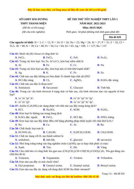 ĐỀ THI THỬ TỐT NGHIỆP THPT LẦN 1 THPT THANH MIỆN NĂM HỌC 2022-2023