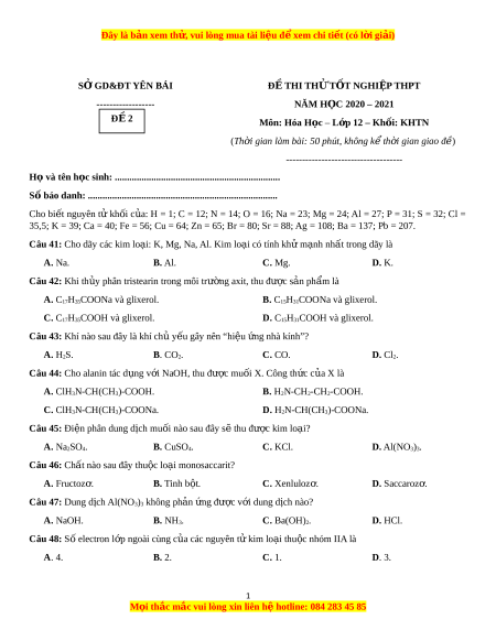 SỞ GD&ĐT YÊN BÁI Đ Ề THI TH Ử TỐT NGHI P Ệ THPT ------------------ NĂM H C Ọ 2020 – 2021 Đ 2 Ề Môn: Hóa H c ọ – L p ớ 12 – Kh i ố : KHTN (Th i