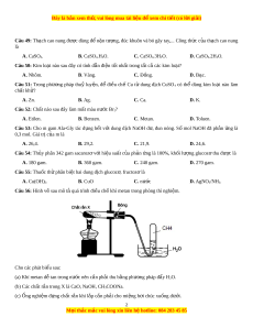 Câu 53: Cho m gam Ala-Gly tác d ng ụ h t ế v i ớ dung d c ị h NaOH d , ư đun nóng. S ố mol NaOH đã ph n ả ng ứ là 0,3 mol. Giá trị c a ủ m là A. 26,4. B. 29,2. C. 21,9. D. 24,6. Câu 54: Th y phâ ủ n 342 gam sacarozơ v i ớ hi u s ệ uất c a ủ ph n ả ng l ứ à 100%, kh i ố lư ng ợ glucoz t ơ hu đư c ợ là A. 180 gam. B. 360 gam. C. 240 gam. D. 270 gam. Câu 55: Thu c ố th phâ ử n bi t ệ hai dung d c ị h glucoz , ơ fructozơ là A. Cu(OH)2. B. CuO C. nư c ớ D. AgNO3/NH3. Câu 56: Hình v s