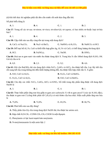 ấ : FeCl2, CuSO4, AlCl3 và KNO3. Số chất trong dãy ph n ả ng ứ đư c ợ v i ớ dung d c ị h NaOH là A. 3. B. 2. C. 4. D. 1. Câu 63: Th c ự hi n ệ ph n ả ng ứ este hóa gi a