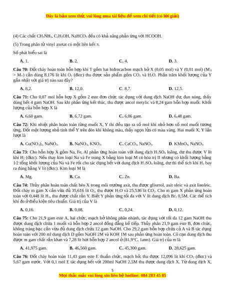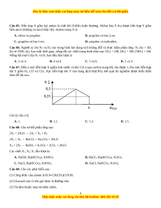 ớ m gam ancol Y (xúc tác H2SO4 đặc), thu đư c ợ m gam este Z (công th c ứ phân t ử C9H10O2) có mùi th m ơ c a ủ hoa nhài. Hi u ệ su t ấ ph n ả ng ứ este hóa là A. 75,0%. B. 72,0%. C. 83,3%. D. 66,7%. Câu 64: Phát bi u nà ể o sau đây đúng? A. Th y phâ ủ n Ala-Gly-Ala trong dung d c ị h NaOH d , t ư hu đư c ợ hai amino axit. B. H p c ợ