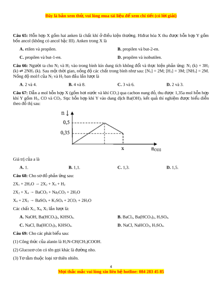 Đây là bản xem th , vu ử i lòng mua tài li u ệ đ xe ể m chi ti t ế (có l i ờ gi i ả ) Câu 65: H n ỗ h p ợ X g m ồ hai anken là ch t ấ khí ở đi u ề ki n ệ thư ng. ờ Hiđrat hóa X thu đư c ợ h n ỗ h p ợ Y g m ồ b n