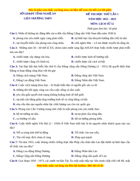 ệ đ xe ể m chi ti t ế (có l i ờ gi i ả ) SỞ GD&ĐT T N Ỉ H NGH Ệ AN Đ Ề THI H C Ọ TH L Ử N Ầ 1 LIÊN TRƯ N Ờ G THPT NĂM H C Ọ 2022 - 2023 MÔN: L C Ị H S 12 Ử Th i