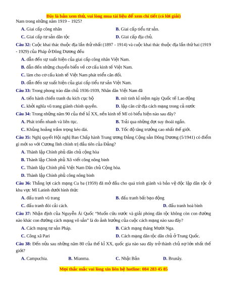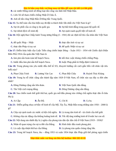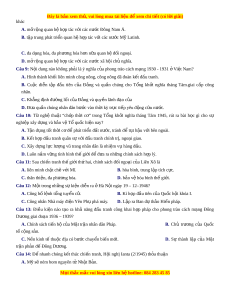 Câu 19: Trong ba tổ ch c ứ c ng ộ s n ả thành l p ậ năm 1929 ở Vi t ệ Nam, tổ ch c ứ nào sau đây ra đ i ờ s m ớ nhất? A. Đông Dư ng c ơ ng ộ s n l ả iên đoàn. B. Vi t ệ Nam Qu c ố dân đ ng. ả C. Tân Vi t ệ cách mạng đ ng. ả D. Đông Dư ng ơ c ng s ộ n đ ả ảng. Câu 20: Sau chi n ế tranh thế gi i ớ thứ hai, qu c ố gia mở đ u ầ phong trào ch ng ố chủ nghĩa th c ự dân ở châu Phi là A. Ai Cập B. Ấn Đ . ộ C. Chi lê. D. Cu ba. Câu 21: Đi m ể gi ng ố nhau c b ơ ản v ki ề nh t c ế a ủ M , ỹ Tây Âu, Nh t ậ B n t ả rong nh ng nă ữ m 1950 – 2000 là gì? A. Ch u ị s c ự ạnh tranh các nư c ớ xã h i ộ ch nghĩ ủ