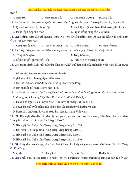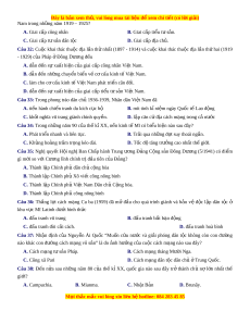 ớ ngoặt vĩ đại trong l c ị h s c ử ách m ng ạ Vi t ệ Nam. Câu 29: H i ộ nghị đ u ầ tiên xác đ nh ị l i ạ nhi m ệ vụ chi n ế lư c ợ c a ủ cách m ng ạ Vi t ệ Nam theo tinh th n ầ Cư ng l ơ ĩnh chính tr đ ị ầu tiên c a ủ Đ ng (1930) l ả à A. H i ộ ngh Ba ị n Chấp hành Trung ư ng Đ ơ ảng (tháng 11/1939). B. H i ộ ngh Ba ị n Chấp hành Trung ư ng ơ Đ ng (t ả háng 7/1936). C. H i ộ ngh Ba ị n Chấp hành Trung ư ng Đ ơ ảng (tháng 5/1941). D. H i ộ ngh Ba ị n Chấp hành Trung ư ng Đ ơ ảng (tháng 11/1940). Câu 30: Hi p ệ đ nh