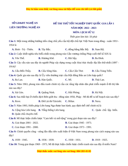Đề thi thử Lịch sử Liên trường Nghệ An lần 2 năm 2023