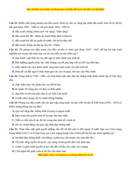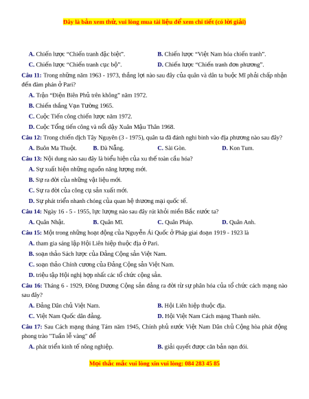 Đây là bản xem th , vu ử i lòng mua tài li u ệ đ xe ể m chi ti t ế (có l i ờ gi i ả ) A. Chiến lư c ợ “Chi n t ế ranh đ c ặ bi t ệ ”. B. Chiến lư c ợ “Vi t ệ Nam hóa chi n ế tranh”. C. Chiến lư c ợ “Chi n t ế ranh c c ụ b ” ộ . D. Chiến lư c ợ “Chi n t ế ranh đ n ph ơ ư ng” ơ . Câu 11: Trong nh ng ữ năm 1963 - 1973, th ng ắ l i ợ nào sau đây c a ủ quân và dân ta bu c ộ Mĩ ph i ả ch p ấ nh n ậ đến đàm phán ở Pari? A. Trận “Đi n Bi ệ ên Ph t ủ rên không” năm 1972.