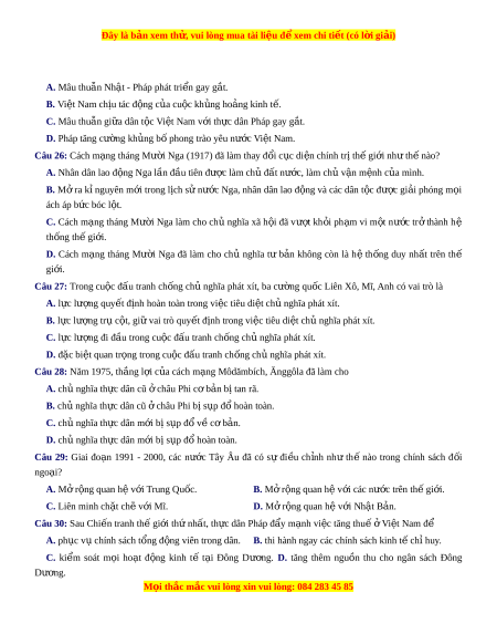 C. Liên minh chặt ch v ẽ i ớ Mĩ. D. M r ở ng qua ộ n hệ v i ớ Nhật Bản. Câu 30: Sau Chi n t ế ranh th gi ế i ớ thứ nh t ấ , th c ự dân Pháp đ y m ẩ nh vi ạ c ệ tăng thu ế ở Vi t ệ Nam để A. ph c ụ v c ụ hính sách t ng ổ đ ng vi ộ