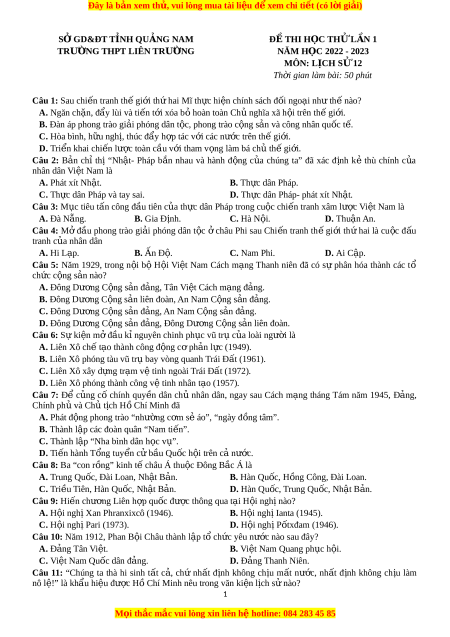 ệ đ xe ể m chi ti t ế (có l i ờ gi i ả ) SỞ GD&ĐT T N Ỉ H QU N Ả G NAM Đ Ề THI HỌC TH L Ử N Ầ 1 TRƯ N Ờ G THPT LIÊN TRƯ N Ờ G NĂM HỌC 2022 - 2023 MÔN: L C Ị H S 12 Ử Th i