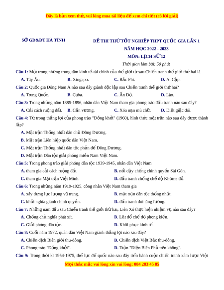 SỞ GD&ĐT HÀ TĨNH Đ Ề THI TH Ử TỐT NGHI P Ệ THPT QU C Ố GIA L N Ầ 1 NĂM HỌC 2022 - 2023 MÔN: L C Ị H S 12 Ử Th i
