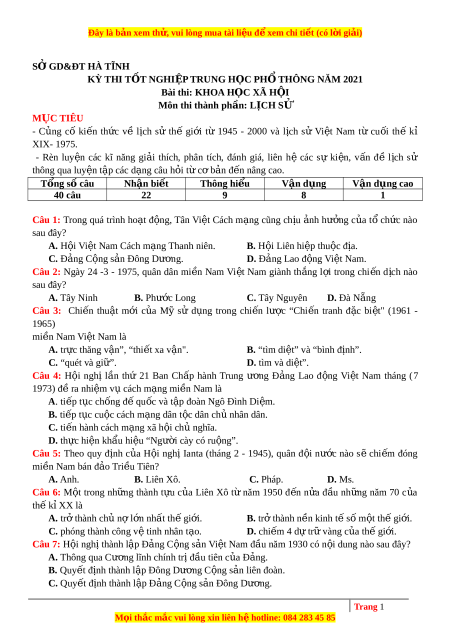 Ở GD&ĐT HÀ TĨNH KỲ THI T T Ố NGHI P Ệ TRUNG H C Ọ PH Ổ THÔNG NĂM 2021 Bài thi: KHOA H C Ọ XÃ H I Ộ Môn thi thành ph n ầ : L CH Ị SỬ M C Ụ TIÊU - C ng ủ cố ki n ế th c ứ về l c ị h sử thế gi i ớ từ 1945 - 2000 và l c ị h sử Vi t ệ Nam từ cu i ố thế kỉ XIX- 1975. - Rèn luy n ệ các kĩ năng gi i